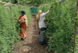 is done by allowing the vines to climb on vertical net support structure to increase yield and make it easy to harvest. The fresh flowers of Butterfly Pea are harvest daily by carefully hand picked, sorted and spread on shelf in solar tunnel drying house for dehydration. The dried flowers of Butterfly Pea are then collected, checked for any containment and packed in jars or stored in air tight poly bags.