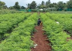 is done in organic method using cow dung farm manure and drip irrigation at spacing of 54″ between laterals and 15″ between plants. Around 19000 Moringa plants per Ha. at our farms in dense plantation. Harvesting of ripe Moringa leaves in done almost every month by hand chopping, then washing and dehydrated in solar tunnel dryer. Moringa Leaves Dried are packed 10 Kg per air tight poly bags and stored for sale or conversion to Moringa Leaves TBC or Moringa Leaves Powder.