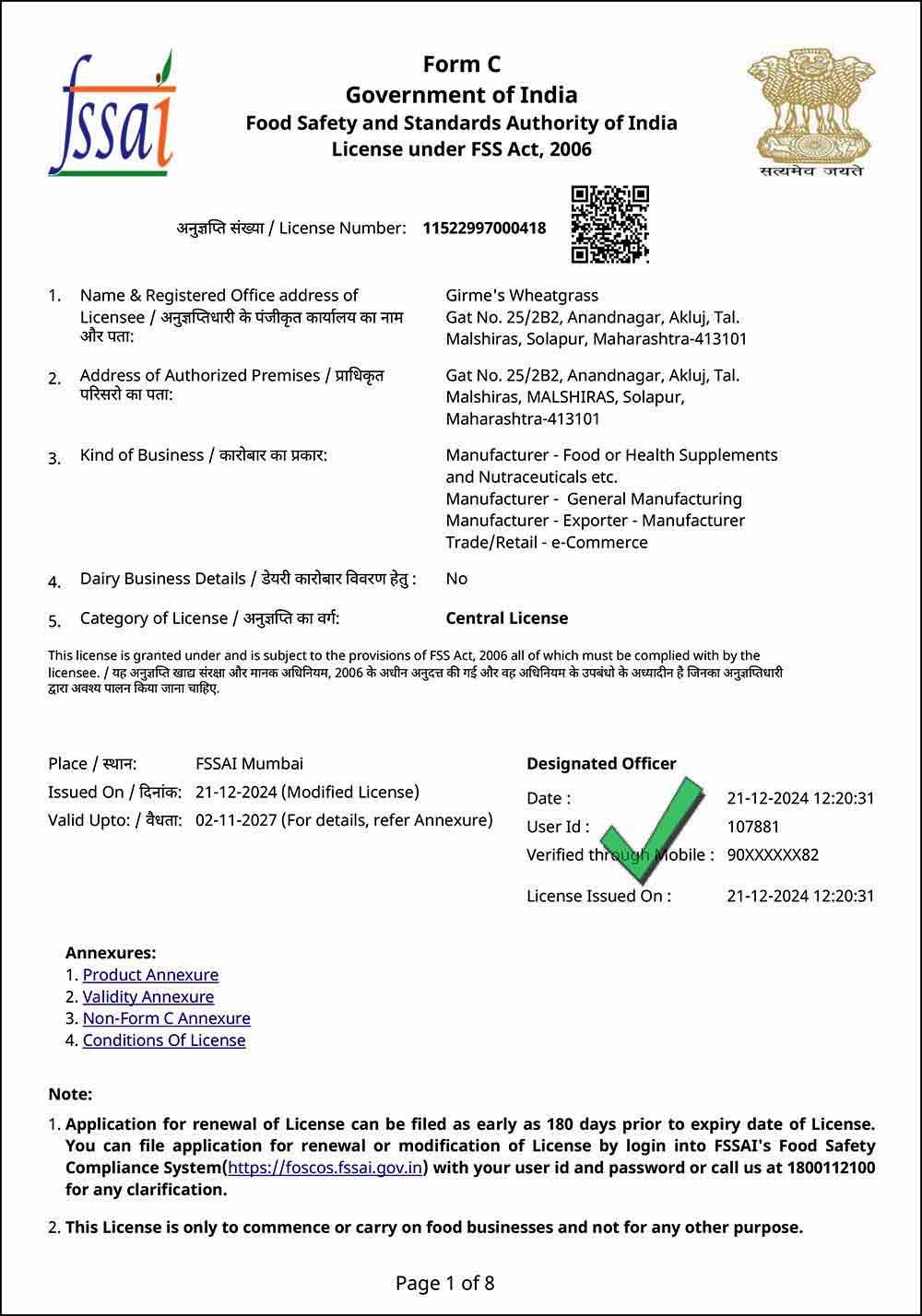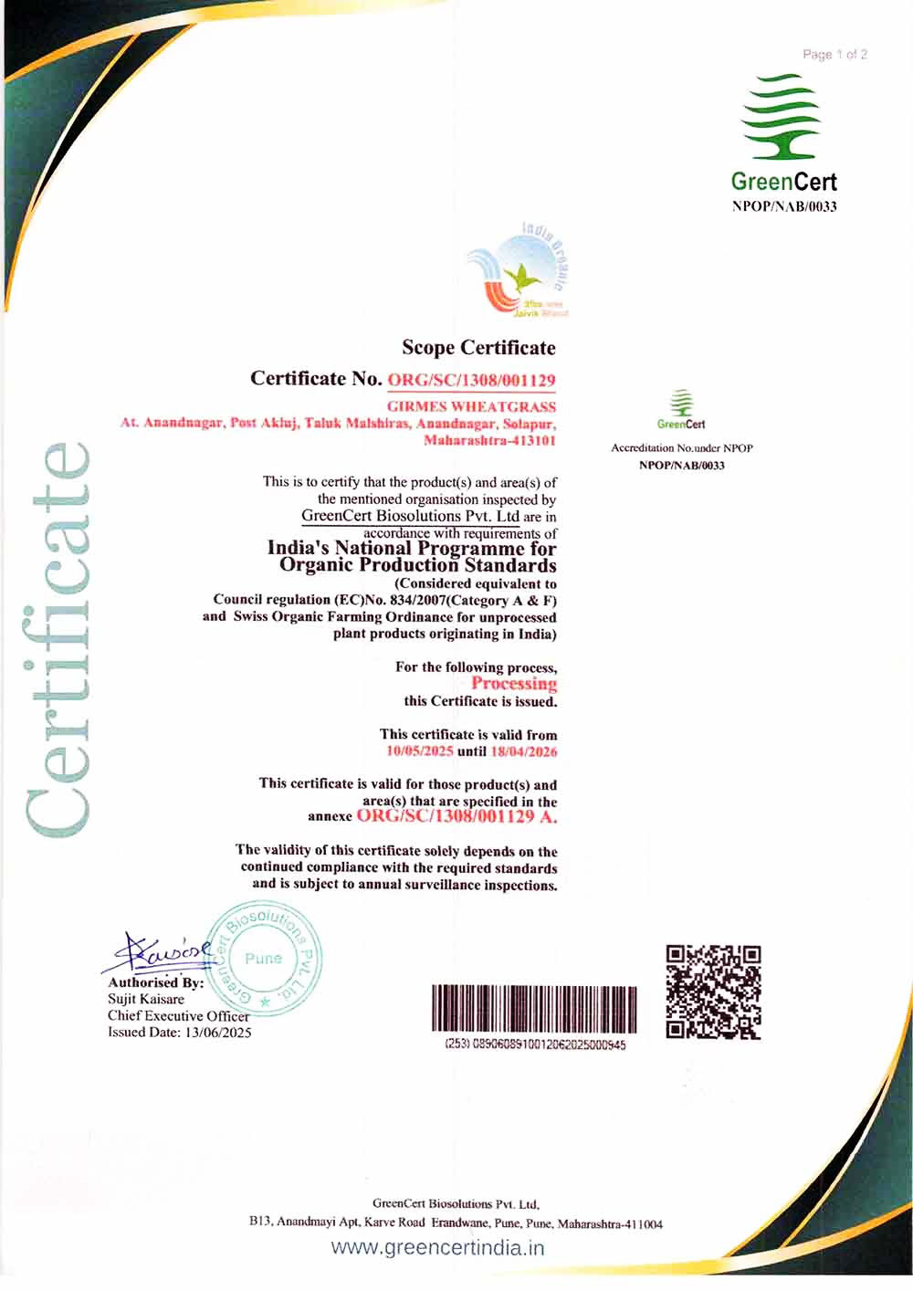 FSSAI Central License since 2022 MSKVIB Reg. Unit: since Apr 2005 Organic Certified: since Apr 2006 ISO / HACCP Certified: since Jul 2009