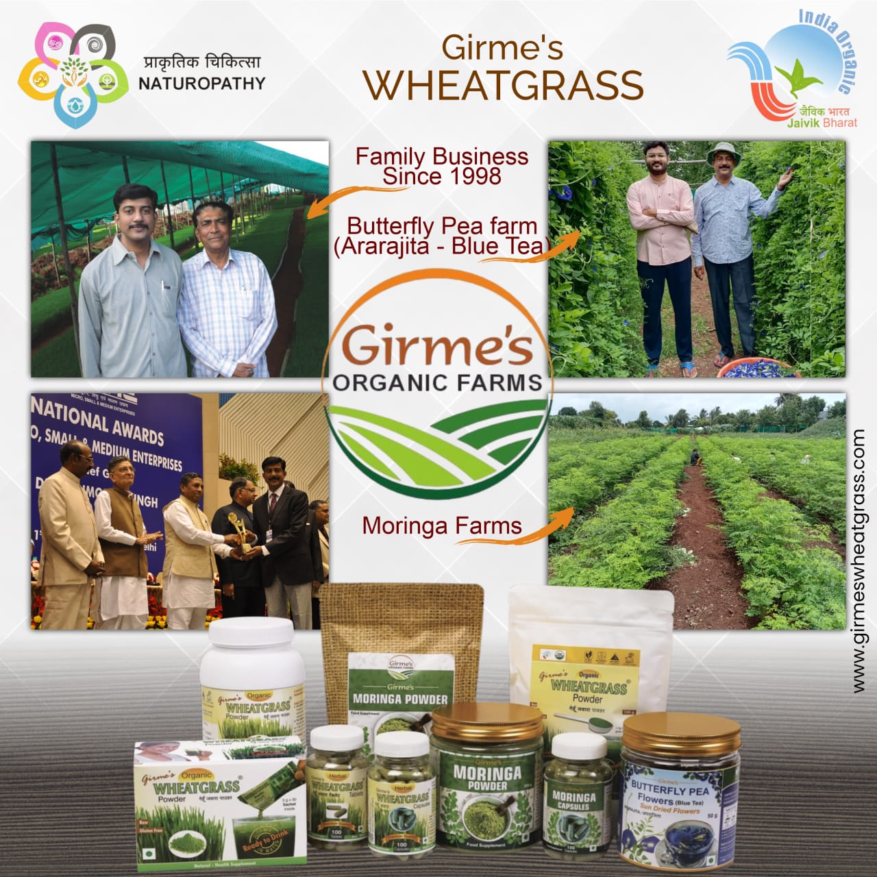 We are a herbal farmer doing Wheatgrass since 2005. Hence from Jan 2025 we have launched Girme’s Organic Farms brand to add more plant based wellness products such as Moringa Oleifera Leaves Powder, Moringa Capsules, etc.