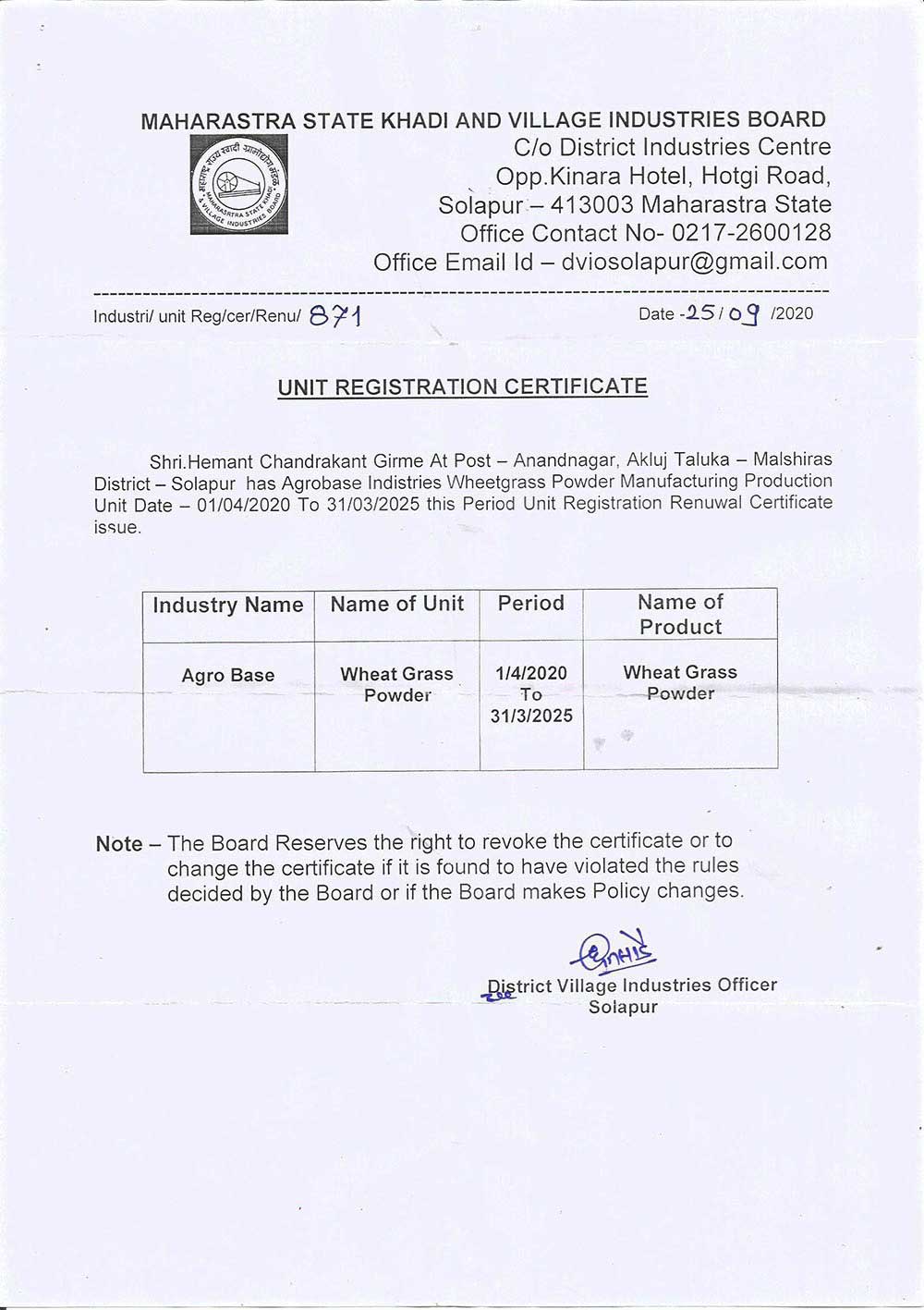 FSSAI Central License since 2022 MSKVIB Reg. Unit: since Apr 2005 Organic Certified: since Apr 2006 ISO / HACCP Certified: since Jul 2009